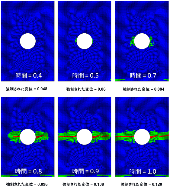 上記の説明の例として、下図に示す進行性破損解析時間内のいくつかの点における SVAR1 = 1、2、3 の PLESOL コンター プロットを検討してください。この複合材料プレートには 8 つの材料層があり、引張が課せられています。見やすいように積層の第 3 層のみを表示しています。これらのプロットでは、青色は破損がない積分点、緑色は母材破損がある積分点、赤色は繊維破損がある積分点を示すために使用されています。