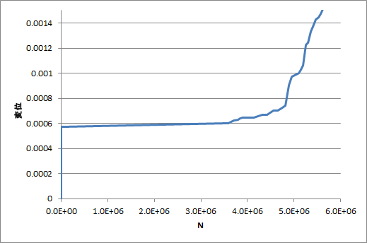 SDV2 プロットは、各要素の破損までのサイクル数を示しています。また、モデルの破損していない領域に対する節点変位と破損サイクルを使用して、以下に示すようにグローバルの構造破損サイクルのプロットを作成することもできます。