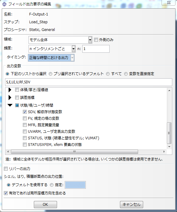 - ヒント: .odb ファイルのサイズを減らし、.odb ファイルへのデータ書き込み時間を短縮するには、後処理で使用される変数のみを出力することを推奨します。次に示すように、既定の出力変数のいくつかは未選択です。