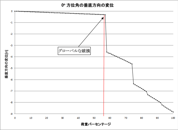 グローバル構造破損はさまざまな方法で定義することができますが、この例の問題を扱う目的で、グローバル破損を、「複合構造の全体的な垂直荷重 - 変位曲線における大きな断続」と定義します。複合構造の全体的な垂直変形の量は、「問題の説明」セクションの図で「0°」とラベル付けされた荷重適用点で垂直変位を使用することにより測定されます。荷重ヘッドとアダプタはリジッドであると考えられるため、荷重 - 変位曲線の大きな断続は、特定の荷重増分中に発生する局所的な材料破損の非常に急速な成長(広がり)を示しています。これによって、複合構造の剛性全体が大きく劣化します。
