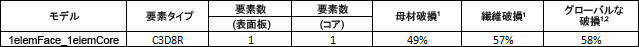 次の表は、3 つのモデルが予測する、各タイプの破損イベント時の荷重レベルを示します。局所的な母材破損および局所的な繊維破損を予測するために使用される基準の詳細については、『理論マニュアル』を参照してください。表について強調すべきことは、母材破損および繊維破損の荷重レベルが、局所的な母材破損または繊維破損が最初に検出されたときの荷重を示すということです。この母材破損または繊維破損の最初のインスタンスは、モデルの要素の 1 つに含まれる材料層の 1 つの中の単一のガウス積分点で発生することに注意してください。数千(あるいは数百万)のガウス積分点を含む大規模な複合構造の場合、複合構造の剛性全体で容易に評価できる変化を検出するには非常に多くの局所的な構成破損が必要です。