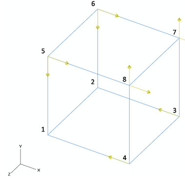 複合材料の縦方向せん断応力/ひずみ応答を示す最も簡単な方法は、縦方向せん断応力成分が残りの応力成分よりもはるかに大きくなるように、単一要要素を拘束および荷重することです。下図のように、純粋せん断応力状態は要素を荷重することで取得できます。