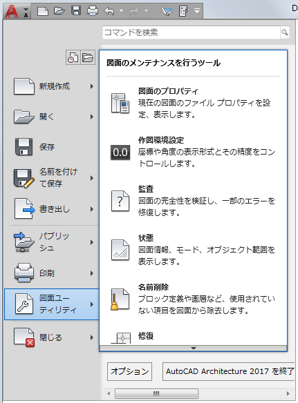 アプリケーション メニューには、図面全体に関係するコマンドが含まれます。