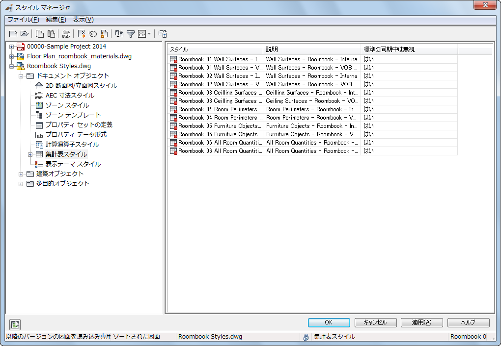 [集計表スタイル]で、図面内の定義済み Roombook 集計表スタイルを読み込みます。