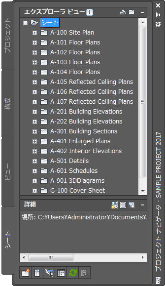 AutoCAD Architecture toolset の建築プロジェクトごとに、次の基本カテゴリ構造が[プロジェクト ナビゲータ]パレットの[プロジェクト]タブに表示されます。