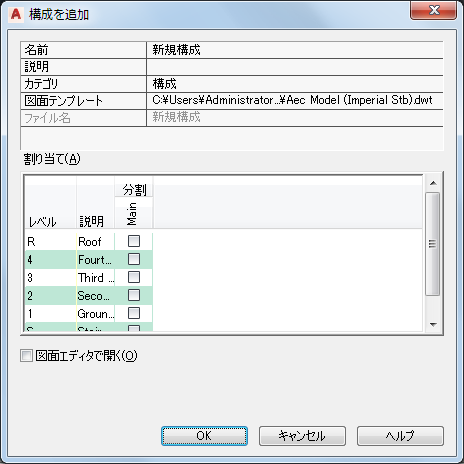 5. この構成をただちに使用する場合は、図面エディタで[開く]を選択します。