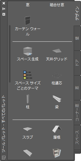 ワークスペースの既定のツール パレットには、構造柱通芯ツールのサンプルがいくつか含まれており、必要に応じてカスタマイズして使用することができます。また、ソフトウェアに付属している次のカタログには、ツール パレットに追加できる構造柱通芯ツールがいくつか含まれています。