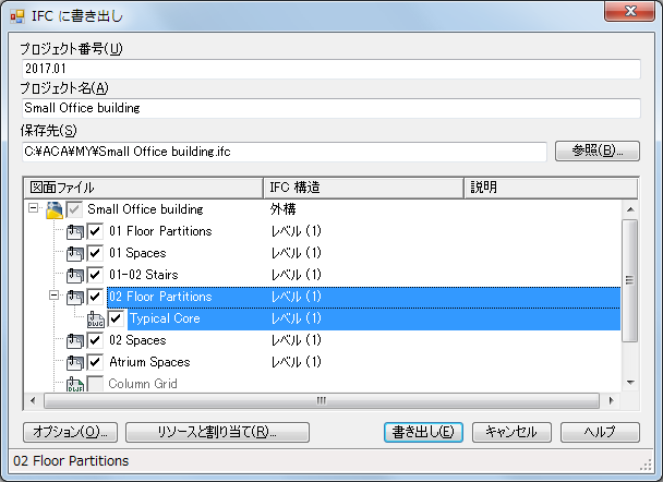外部参照を IFC ファイル内で異なるレベルとして表示する必要がある場合は、[IFC 構造]で別の識別ラベルを指定します。レベル(1)などの同じ識別子を複数の外部参照に対して指定し、これらの外部参照内のオブジェクトを 1 つの IfcBuildingStorey に結合することができます。