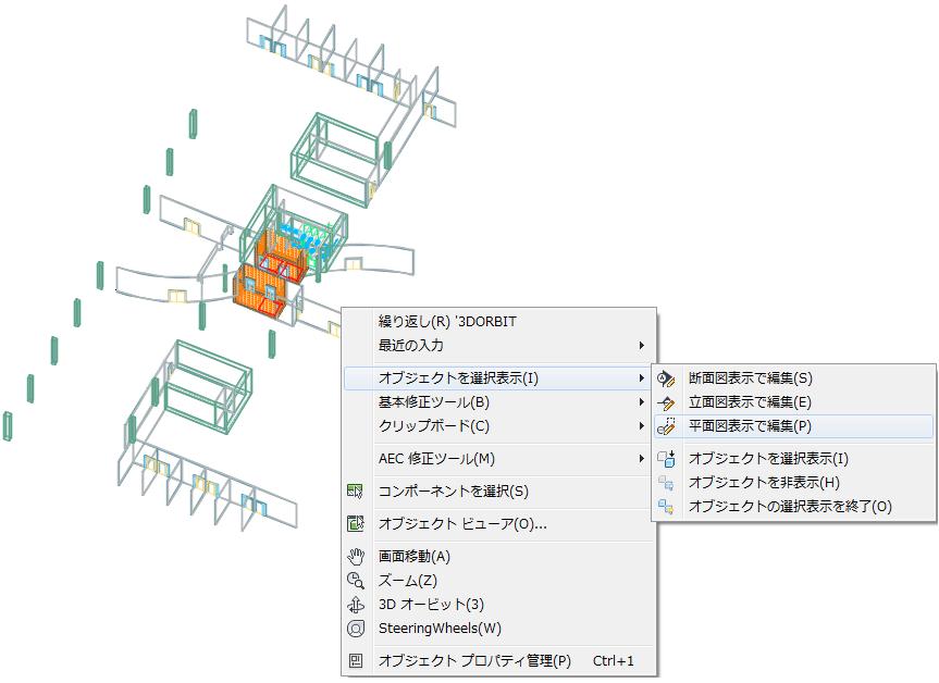 図面内でオブジェクトの選択を指定し、それらのオブジェクトを一時的な断面ビュー、立面ビュー、またはプラン ビューで編集できます。UCS を編集するときには、UCS は一時ビューに位置合わせされます。