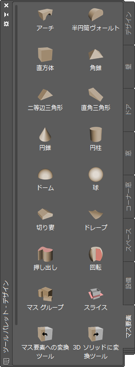 CAD マネージャや他のユーザが独自に作成したパレットに含まれるマス要素ツールでは、プロジェクトや会社の標準に合わせてマス スタイルとマス プロパティがカスタマイズされていることがあります。