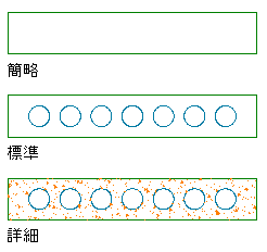 カスタム形状を作成すると、3 つの独立したジオメトリ([簡略]、[標準]、[詳細])を定義して、異なるレベルの内容を、異なる表示レベル([簡略プラン]、[プラン]、[詳細プラン]など)に供給できます。新しい形状のジオメトリを作図領域の線図から完全に設定するか、既存のカスタム形状の定義をテンプレートとして使用し、そのジオメトリのいずれかを編集して再定義できます。