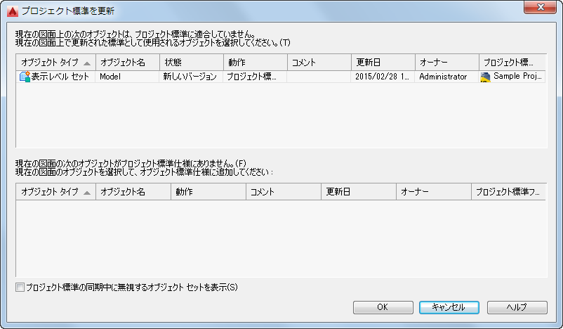 この場合は、プロジェクト標準図面のバージョンは、プロジェクト図面のバージョンで上書きされません。プロジェクト図面の次回の同期中に、この表示設定はプロジェクト標準仕様での同期外として表示されます。