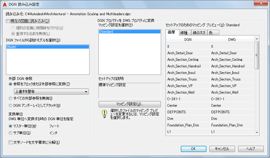 現在の DGN 読み込みに使用するマッピング設定を選択および管理します。