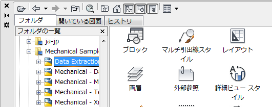 [DesignCenter]ウィンドウの左側部分のツリー表示と DesignCenter のタブを使用して、コンテンツを検索したりコンテンツ領域にロードすることができます。