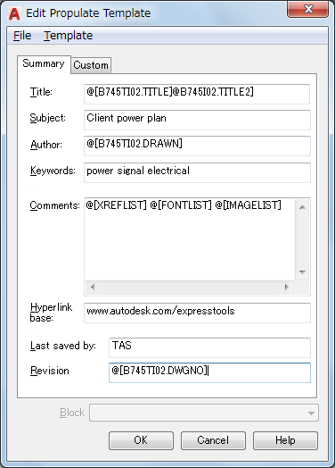 | @[block.attributeTag] | 属性を持つブロックから属性タグの値を抽出し、これを指定されたフィールドに挿入します。例: [Author]フィールドに @[title.drawnby] を挿入すると、PROPULATE は図面で属性を持つブロックの名前の付いたタイトルを検索し、[Drawnby]属性フィールドの値を抽出し、この値を図面の図面のプロパティ ダイアログ ボックスの[Author]フィールドに挿入します。プロジェクト全体で共通のブロックが使用されている場合は、ブロックの特定の属性値を反映するように多数の図面を更新するのは極めて簡単です。 |