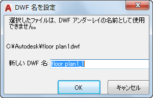 アタッチする DWF または DWFx 参照の名前は一意でなくてはなりません。同じ名前の 2 つの DWF または DWFx 参照をアタッチしようとすると、[DWF 名を設定]ダイアログ ボックスが表示されます。