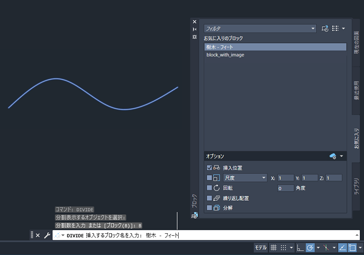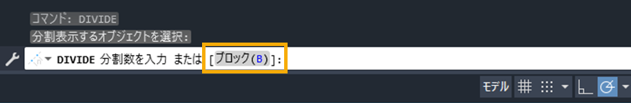 | DIVIDE[ディバイダ] | オブジェクトの長さまたは周長に沿って等間隔に、点オブジェクトまたはブロックを作成します。 |