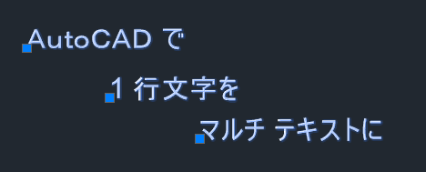場合によっては、1 行文字オブジェクトを含む図面を他のユーザから引き継ぐことがあり、それらが 1 つのマルチ テキスト オブジェクトであれば管理しやすくなる場合があります。1 行文字をマルチ テキストに変換してみましょう。