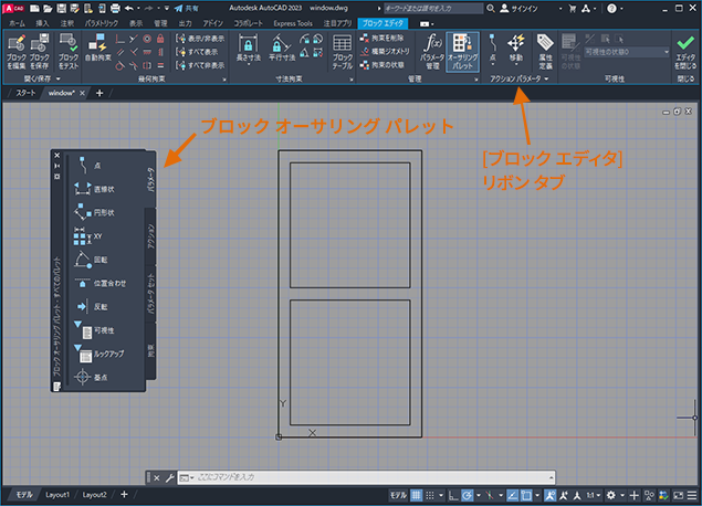 たとえば、平面図と立面図で異なる幅の窓を表すストレッチ可能なプロパティを含む単一のダイナミック ブロックを作成することができます。