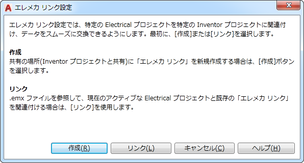 AutoCAD Electrical toolset プロジェクトと Inventor プロジェクトの間のデータ交換を容易にするには、エレメカ リンク ファイルを作成するか、既存のリンク ファイルにアクティブなプロジェクトをリンクします。