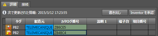 タグ、装置、およびロケーション属性に差異がある場合、これらの属性は[Inventor を承認]機能の一部ではないため、Electrical コンポーネントの値を同等の Inventor の値で手動更新します。