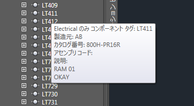 コンポーネント ツリーの表示は、デバイス タイプに応じて異なります。エレメカ コンポーネントを挿入する際は、一意の名前(装置コード、ロケーション コード、コンポーネント タグ)、ピン番号、端子番号を指定することをお勧めします。たとえば、図面にケーブル マーカーがあり、ケーブル タグの値が重複している場合、コンポーネント ツリー表示や[接続]タブのコンポーネントについて予期しない動作が発生する可能性があります。この問題は、[ロケーション ビュー]の端子およびケーブル マーカーで発生する頻度が高いことが確認されています。