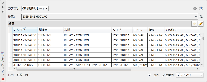 たとえば、カタログ値を指定せずにリレー コイルで[参照]をクリックすると、[カタログ ブラウザ]は、「600VAC」リレーの Siemens パーツ番号を検索します。カタログ データベース ファイルを編集して、_LISTBOX_DEF テーブルを選択します。これらのフィールド値を持つレコードを挿入します。