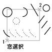 2 つの点で指定した長方形と交差するまたはその長方形の内側にある、すべてのオブジェクトが選択されます。その長方形の点の指定順序が右から左の場合は、[交差(C)]が採用されます。左から右の場合は[窓(W)]と同じ動作をします。
