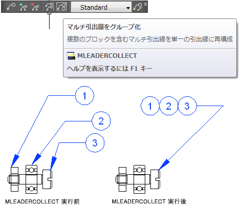 内容としてブロックを使用したマルチ引出線オブジェクトを、1 つの参照線に集めて、アタッチできます。MLEADERCOLLECT[マルチ引出線グループ化]コマンドを使用すると、マルチ引出線が、図面での必要性に応じて、水平、垂直、または指定した領域内に集約されます。