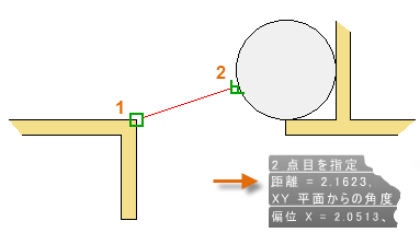 DIST[距離計算]コマンドを開始した後、コーナー(1)の端点をクリックします。次に、[Shift]を押しながら右クリックし、オブジェクト スナップ メニューから[垂線]を選択します。最後に、円(2)をクリックします。