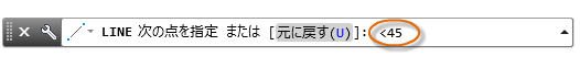 特定の角度で線分を描く必要がある場合、次に指定する点に対して角度をロックすることができます。たとえば、線分の 2 点目を 45 度の角度で作成する必要がある場合は、コマンド ウィンドウに <45 と入力します。