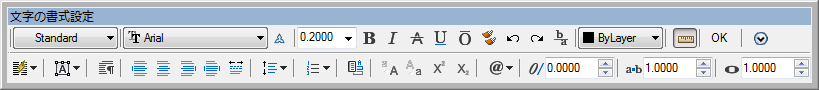 [文字の書式設定]ツールバーの表示をコントロールします。このオプションにより、システム変数 MTEXTTOOLBAR が設定されます。(1 行文字の場合は使用できません)