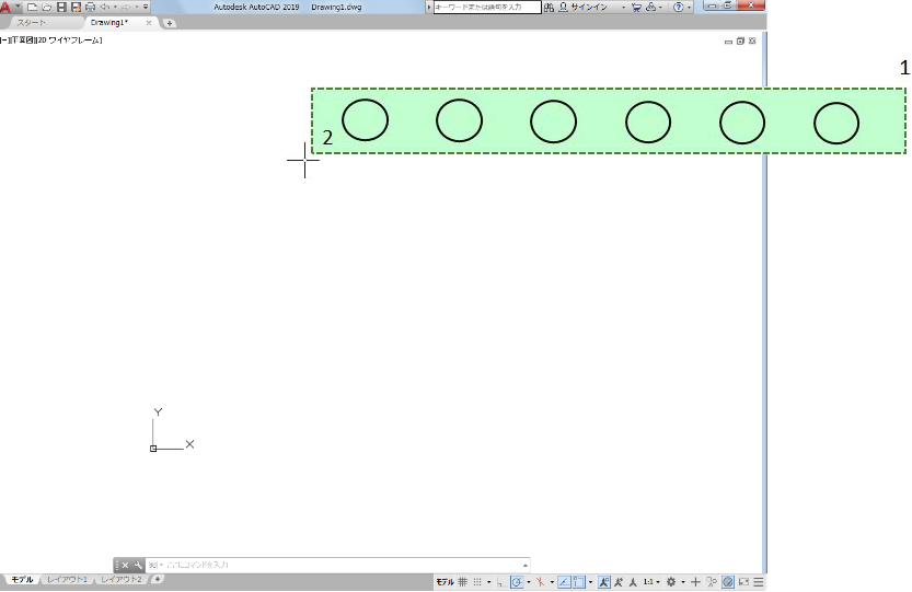 SELECTIONOFFSCREEN をオンに設定すると、オフスクリーン(図で、点 1 がメイン表示画面の外側)の図形が、選択の対象となるようになりました。