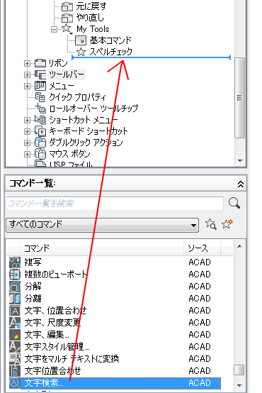 6. ドロップダウン メニューに追加するコマンドまたはコントロールを、[コマンド一覧]ペインから[<ファイル名> 内のカスタマイズ]ペインにドラッグします。
