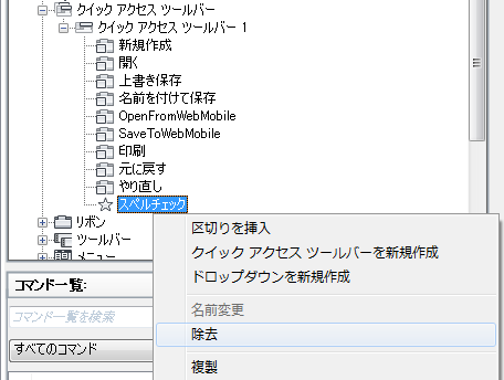 3. 除去するコマンドまたはコントロール右クリックし、[除去]を選択します。