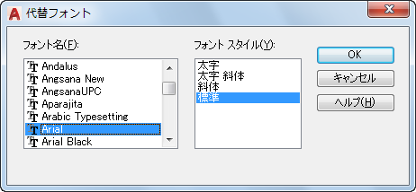代替フォントを指定していない場合、開こうとしている図面ファイルで使用されているいずれかのフォントが見つからないとき、それぞれの見つからないフォントについて代りに使用するフォントを指定するためのダイアログ ボックスが表示されます。