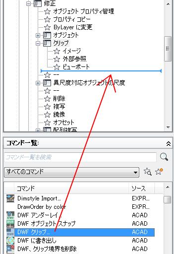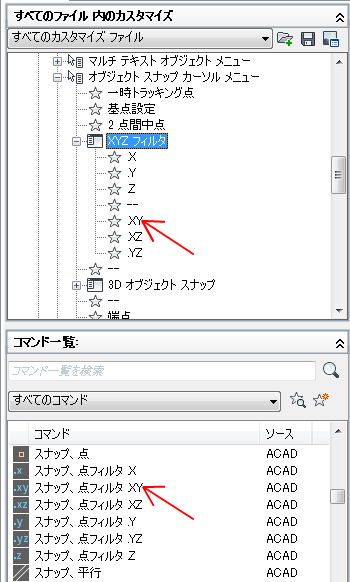 - [カスタマイズ]タブの[コマンド一覧]ペインで、[ <ファイル名> 内のカスタマイズ]ペインのユーザ インタフェース要素に追加するコマンドを検索してドラッグします。