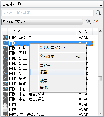 - [カスタマイズ]タブの[コマンド一覧]ペインで、複製を作成するコマンドを探します。