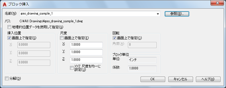 ブロックを分解し、ブロックの個々の要素を挿入します。[分解]をオンにした場合は、[XYZ 尺度を均一に設定]が自動的にオンになります。