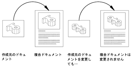 埋め込みとリンクの関係は、AutoCAD でブロックを挿入することと外部参照を作成することとの関係に似ています。