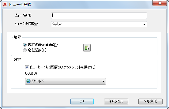 現在のビューポートの表示画面から、または矩形の窓を定義することにより、名前の付いたビューを新規登録します。