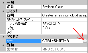4. [プロパティ]ペインで、[キー]ボックス内をクリックしてから[]ボタンをクリックして、[ショートカット キー]ダイアログ ボックスを開きます。