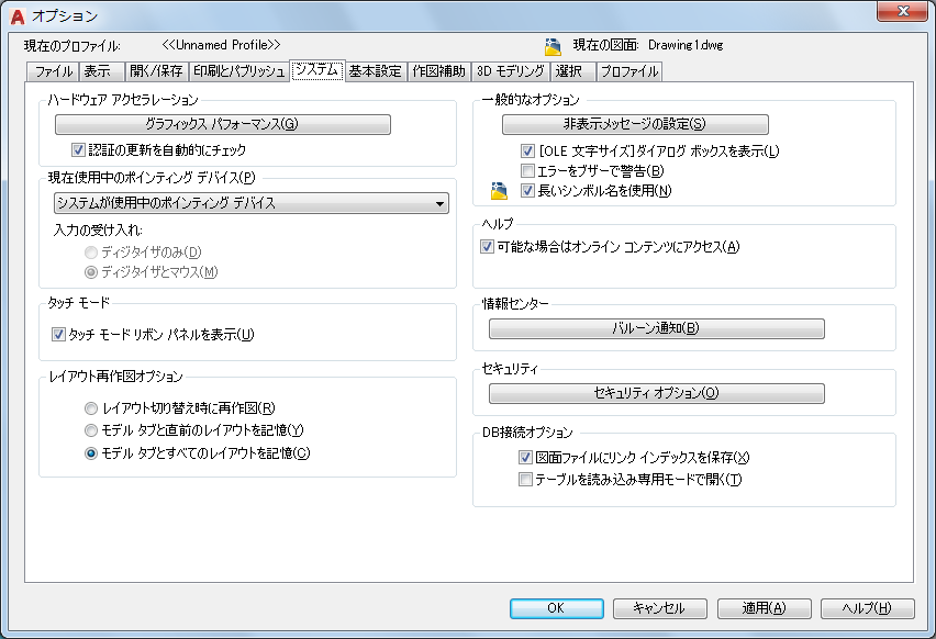 タブごとに、そのタブに切り替えたとき図面を再作図するか、そのタブに切り替えたときにディスプレイ リストをメモリに保存して変更されたオブジェクトだけを再作図するか、いずれかの方法によってディスプレイ リストが更新されます。この設定を変更すると、パフォーマンスを向上させることができます。(システム変数 LAYOUTREGENCTL)