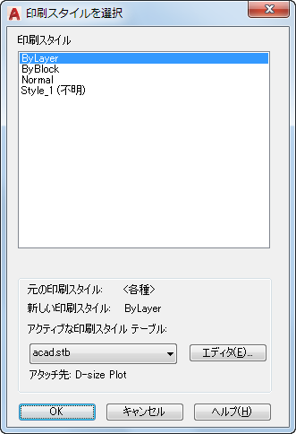 現在の図面にアタッチされている印刷スタイル テーブルが表示されます。印刷スタイル テーブルは、印刷スタイルを定義したものです。