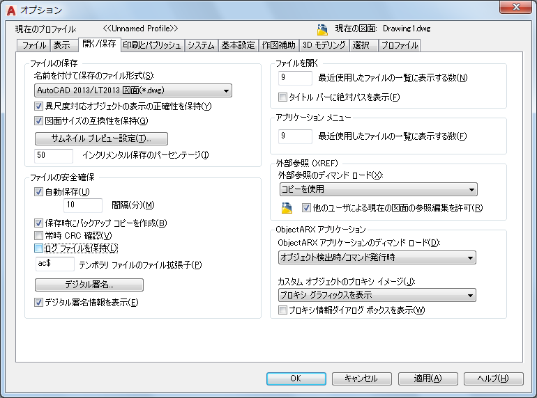 SAVE[保存]、SAVEAS[名前を付けて保存]、QSAVE[上書き保存]、WBLOCK[ブロック書き出し]コマンドを使用してファイルを保存するときに使用される有効なファイル形式が表示されます。このオプションで選択したファイル形式は、保存する図面の既定の形式になります。