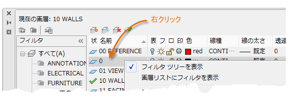 画層リスト一番上にフィルタを表示します。画層リストに画層のみを表示するには、このオプションをオフにします。