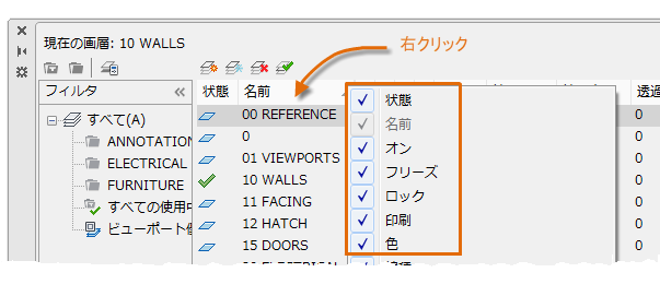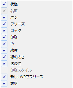 すべての列を名前別に一覧表示します。チェック マークが付いている列は、表示に含まれています。列名をクリックすると、列の表示と非表示が切り替わります。[VP でフリーズ]、[VP の色]、[VP の線種]、[VP の線の太さ]、[VP の印刷スタイル]は、レイアウト ビューポートがアクティブな場合に限り有効です。