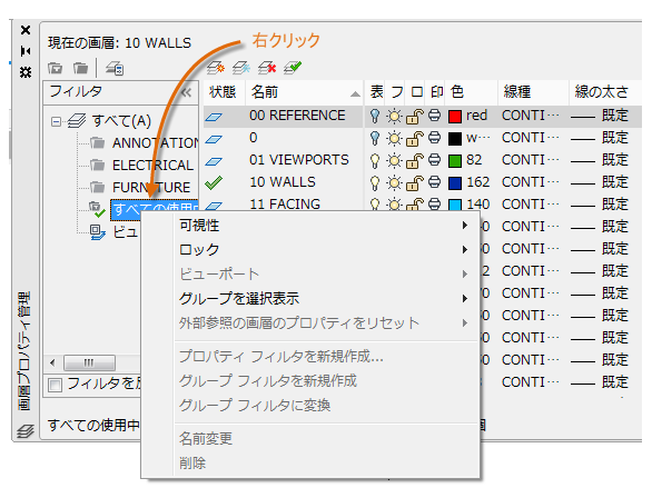 選択した画層を現在の画層に設定します。新しいオブジェクトは自動的に現在の画層に作成されます。(システム変数 CLAYER)