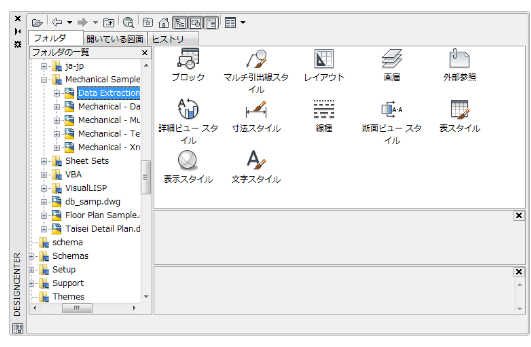 [フォルダ]タブまたは[開いている図面]タブをクリックすると、次の 2 つのペインが表示されます。これらのペインで図面のコンテンツを管理できます。