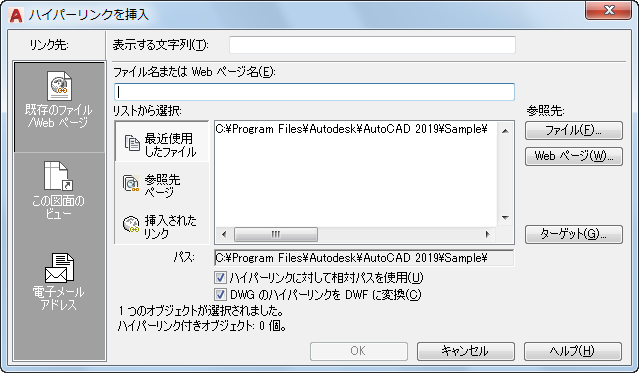 ハイパーリンクに関連付けたファイルへのパスが表示されます。[ハイパーリンクに対して相対パスを使用]チェック ボックスをオンにしているときは、ファイル名だけが表示されます。このチェック ボックスをオフにしているときは、絶対パスとファイル名が表示されます。